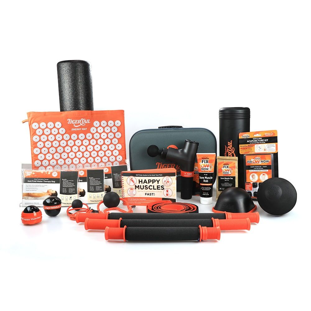 The All-In Everything Muscle Care Kit offers all of Tiger Tail’s amazing tools to massage your whole body from head to toe, help relieve sore muscles, soothe stress, and tension, and recover. This kit includes 22 muscle care tools: The Original™ 18″, The Long One™ 22”, The Roadster™ 11″, Tiger Ball® 2.6 Massage-on-a-Rope, Tiger Ball® 5.0, Tiger Ball® 1.7, The Curve Ball®, The Knotty Tiger™, The Knotty Tiger™ Jr., The Big One™, The Essential One™ 24″, DrySoak™ Hot Water Therapy Pillow (Small 2-pack, Medium, Large), The Knotty Dots™, The Happy Muscles® Book, The Grippy Strips (5-Pack), The Stretchy Tiger 80″, Acupressure Energy Mat, Sore Muscle Rub 2.7 oz (x2), and the T-1000 Vibration Massage Gun.
