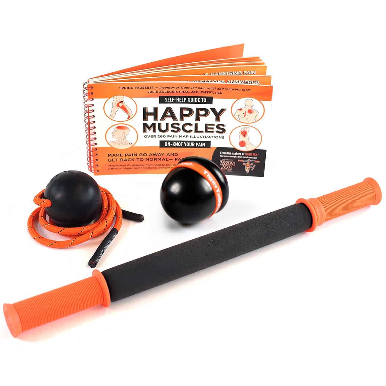 The Happy Muscles Kit plus 18″ includes 4 amazing tools to massage your body from head to toe, help relieve sore muscles, soothe stress and tension, and recover. The kit includes The Original™ 18” Foam Roller Stick, Tiger Ball® 2.6 Massage-on-a-Ropes, The Knotty Tiger® Pro Handheld Massager, and Happy Muscles® Book.