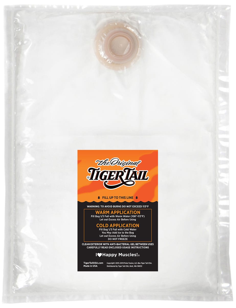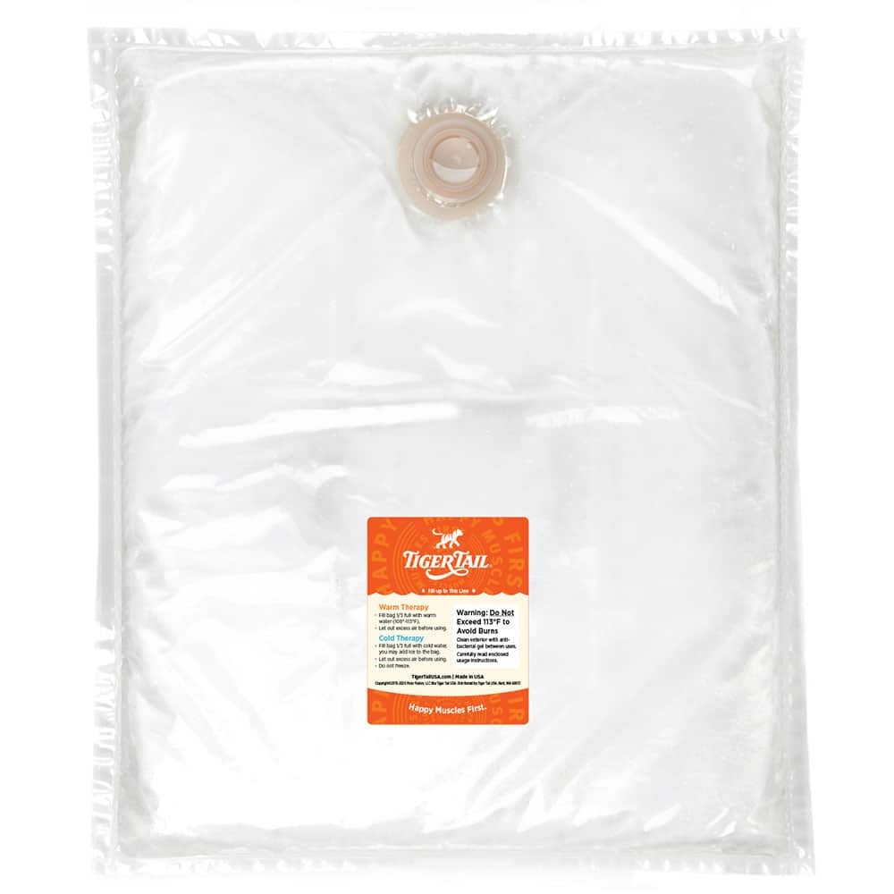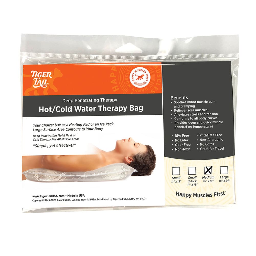 The Tiger Tail DrySoak™ Hot Water Therapy Pillows are simple, yet effective tools to apply warm, “moist” heat to help with muscle pain. FSA-eligible, the DrySoak pillows relieve sore muscles, soothe minor muscle pain and cramping, and alleviate stress and tension. The thin, lightweight, sturdy pillows can support up to 600 lbs of pressure. They are designed to deliver heated therapy (cold therapy too!) to any part of the body quickly and easily by conforming to all body curves. Simply, and easily fill the pillows with warm or hot tap water. The DrySoak pillows are super strong and will not leak! Plus, the pillows stay warm for hours, although not “off the tap” warm. Our founder has used these overnight and finds the temperature to be insulated and warmer than body temperature for more than 7 hours. Each bag is constructed of a soft, pliable, double-layered, lightweight polymer plastic. The secure, leak-proof lid, “pops” on and off easily. For cooling/icing, just add ice cubes or cold water (do not freeze). The bag opening is large enough to fill easily and accommodate most sizes of ice cubes. Hypoallergenic, No Latex, No Odor. The DrySoak pillows come in three sizes: Large (21″ x 23″), Medium (15” x 18”), Small (11” x 15”).