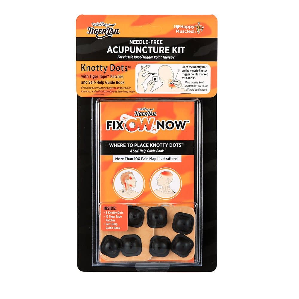Knotty Dots™ with Tiger Tape™ Patches and Fix “Ow” Now Self-Help Guide Book, featuring pain mapping patterns, trigger point locations, and self-help treatments from head to toe. The Knotty Dots stimulate the trigger point/muscle knots, like acupuncture without the needle, while the Tiger Tape Patches attach the Knotty Dots to your skin, allowing constant pressure on your muscle knots/trigger points. Simply place the Knotty Dot on the skin over the muscle knots/trigger points designated by the “x” on the self-help guidebook and let it massage you throughout the day. Kit includes 8 Knotty Dots, 16 Tiger Tape Patches, and 1 Self-Help Guide Book.