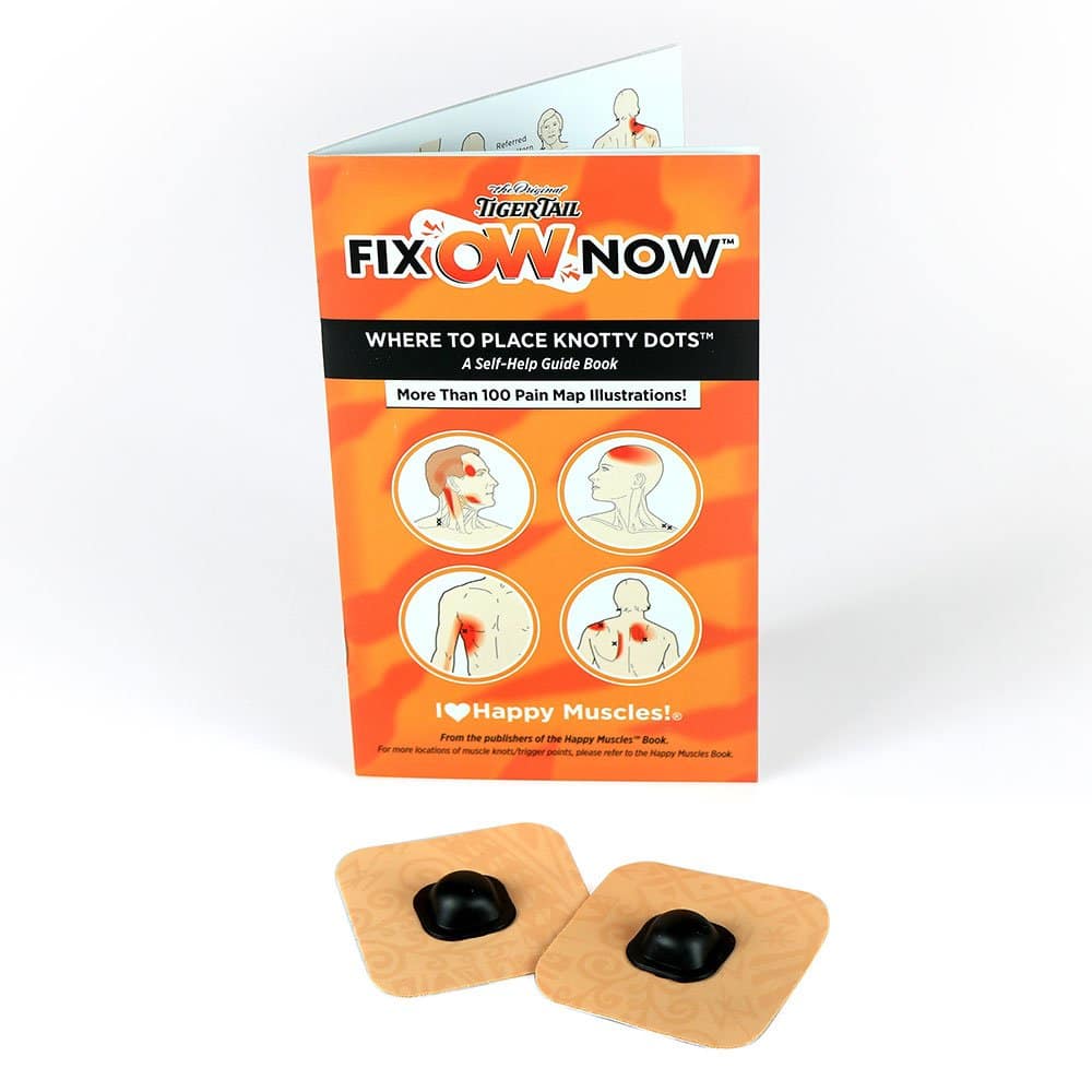 Knotty Dots™ with Tiger Tape™ Patches and Fix “Ow” Now Self-Help Guide Book, featuring pain mapping patterns, trigger point locations, and self-help treatments from head to toe. The Knotty Dots stimulate the trigger point/muscle knots, like acupuncture without the needle, while the Tiger Tape Patches attach the Knotty Dots to your skin, allowing constant pressure on your muscle knots/trigger points. Simply place the Knotty Dot on the skin over the muscle knots/trigger points designated by the “x” on the self-help guidebook and let it massage you throughout the day. Kit includes 8 Knotty Dots, 16 Tiger Tape Patches, and 1 Self-Help Guide Book.