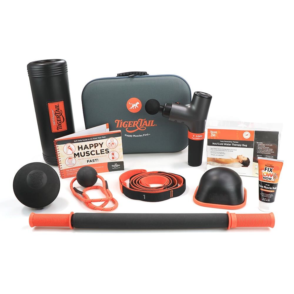 The Back Muscle Care Kit is a combination of amazing tools created to work out muscle knots and relieve sore muscles in the back, shoulders, glutes, and other hard-to-reach muscles. You can work with it on the floor, bed, chair, or wall by yourself. This kit includes 10 muscle care tools: The Original™ 22, Tiger Ball® 2.6 Massage-on-a-Rope, Tiger Ball® 5.0, Curve Ball®, The Big One™, DrySoak™ Hot Water Therapy Pillow (Large), Happy Muscles® Book, Stretchy Tiger, Sore Muscle Rub 2.7 fl oz, and the T-1000 Vibration Massage Gun.