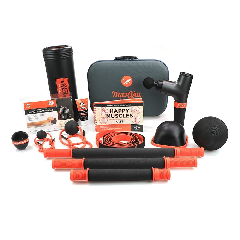 The Ultimate Muscle Care Kit offers all of Tiger Tail’s amazing tools to massage your whole body from head to toe, help relieve sore muscles, soothe stress, and tension, and recover. This kit includes 14 muscle care tools: The Original™ 18, The Original™ 22, The Original™ 11, Tiger Ball® 2.6 Massage-on-a-Rope, Tiger Ball® 5.0, Tiger Ball® 1.7, Curve Ball®, Knotty Tiger®, The Big One™, DrySoak™ Hot Water Therapy Pillow (Medium), Happy Muscles® Book, Stretchy Tiger 80″, Sore Muscle Rub 2.7 fl oz, and the T-1000™ Vibration Massage Gun.