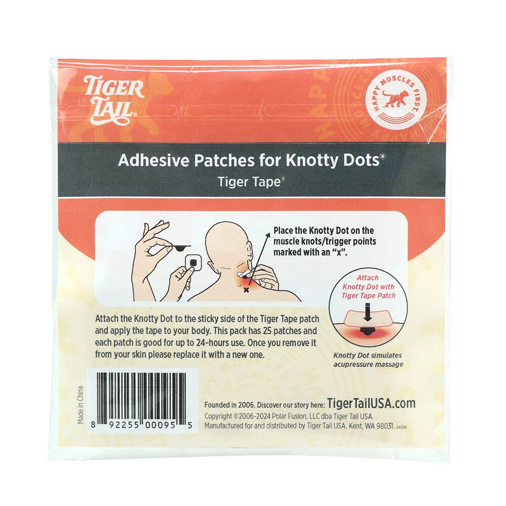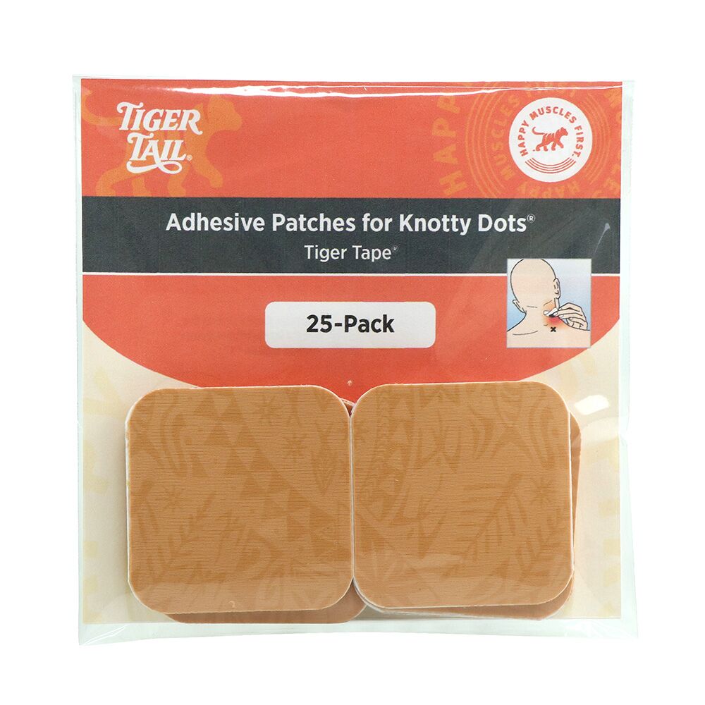 Tiger Tape® Patches 25-Pack for the Knotty Dots®. Tiger Tape patches are the most effective adhesive body tape to attach the Knotty Dots needle-free acupuncture/acupressure to your body. Attach the Knotty Dot to the sticky side of the Tiger Tape patch and apply the tape to your body. Each package has 25 Tiger Tape patches and each patch is good for up to 24-hours use. Once you remove it from your skin please replace it with a new one.